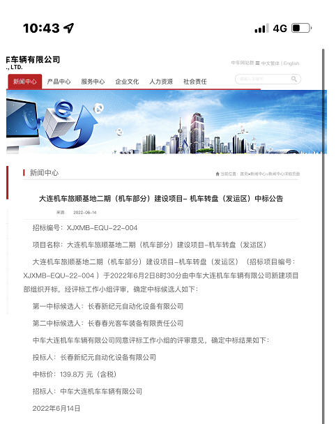 大連機車(chē)旅順基地二期(機車(chē)部分)建設項目-機車(chē)轉盤(pán)(發(fā)運區)中標公告